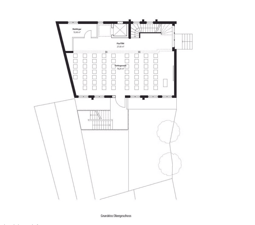 Auch Barrierefreiheit kรถnnte im Gebรคude durchgehend hergestellt werden. An der Lรคngsseite des Gebรคudes kann ein barrierefreier Zugang mittels langgezogener Rampe รผber den ehemaligen Schulzugang in den Gemeinschaftsraum fรผhren. Ein kleiner Personenaufzug kann neben der bestehenden Treppe eingebaut werden. Gegenรผber dem geplanten Aufzug kann ein behindertengerechtes WC geschaffen werden.