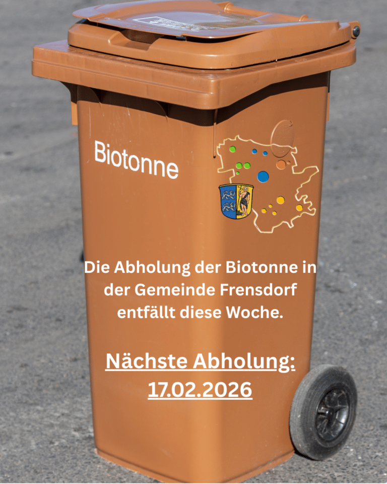 Die Biotonnenleerungen, die für die Kalenderwochen 5 und 6/2026 geplant waren, entfallen. Da die aktuelle Witterung Gartenarbeiten ohnehin nicht zulässt, werden die Haushalte gebeten, ihr Biogut über die Restkapazität der Biomülltonnen zu entsorgen. Der reguläre Bio-Sammelbetrieb wird planmäßig ab dem 9. Februar 2026 wieder aufgenommen.