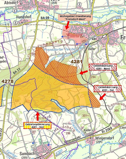 Im Rahmen des Beteiligungsverfahrens zur Entwicklung von Vorranggebieten fรผr Windenergieanlagen hat der Gemeinderat Stellung bezogen. Um lรคrmtechnische Konflikte mit dem Ort Frensdorf vollends auszuschlieรen und groรzรผgige baulichen Entwicklungsmรถglichkeiten fรผr Frensdorf vorzuhalten, wurde beschlossen, den Abstand von Windenergiestandorten zum sรผdlichen Ortsrand von Frensdorf auf mindestens 1.500 Metern zu vergrรถรern. Das geplante Vorranggebiet des Regionalplanes "Windenergie" soll deshalb im nรถrdlichen Bereich flรคchenmรครig deutlich eingekรผrzt werden. Dafรผr werden folgende Grรผnde angefรผhrt: