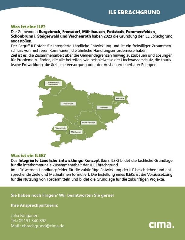 Die ILE Ebrachgrund freut sich auf Ihre Projektideen. Es hilft Ihnen gerne Frau Svenja Schäfer (ebrachgrund@cima.de; 0152 26849307) bei der Antragstellung.